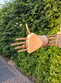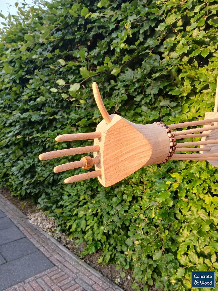 Na wat speurwerk een alternatief gevonden, massief hout vervangen door spijlen. Eerste poging waren een hoeveelheid ribben en botten, de verbindig daarvan gaf veel technische onmogelijkheden. Niet conform de realiteit, daarom uiteindelijk de denkbeeldige botten en ribben verticaal gemaakt van spijlen beukenhout, uiteindelijk kwam bij alles wat we hebben ontworpen de vraag: hoe verbinden we de onderdelen? Duidelijker kan het begrip verbinding niet of nauwelijks worden weergegeven.