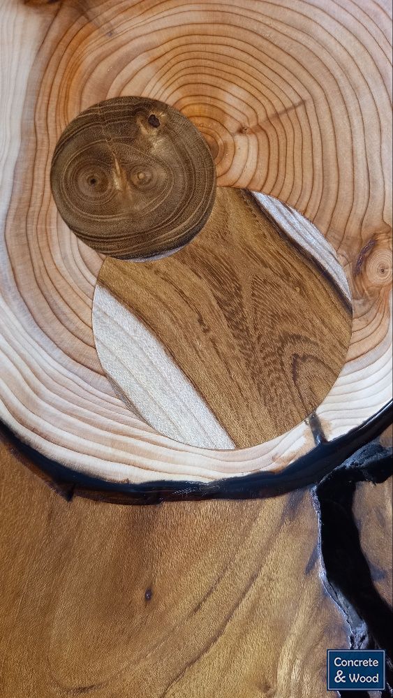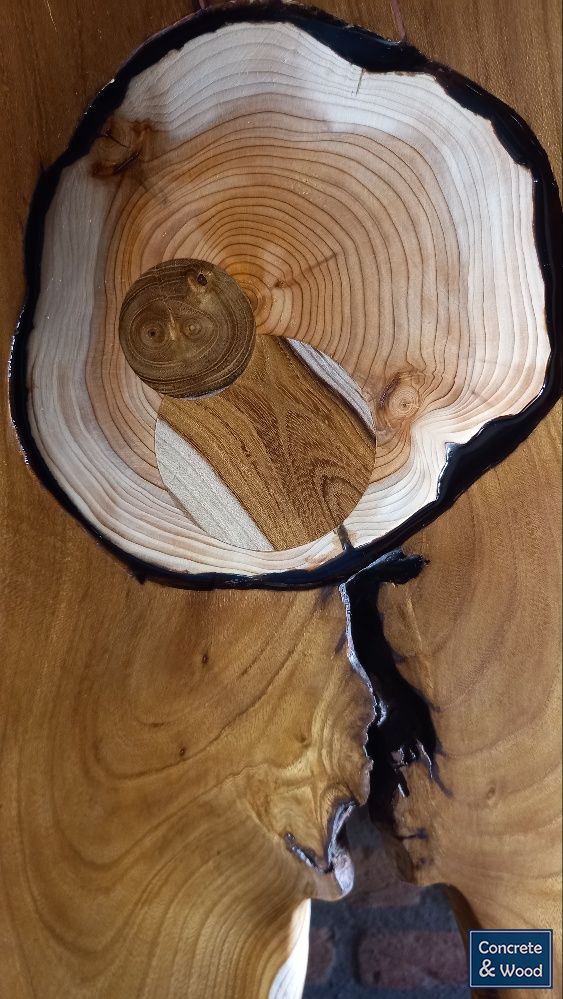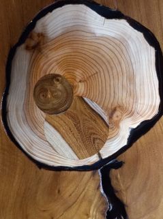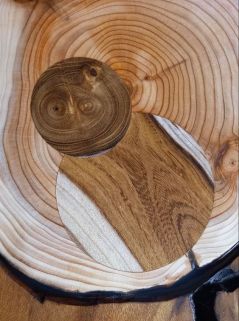 Een paar takken van dezelfde goudenregen boom zijn gebruikt en ingelegd in een dwarsdoorsnede van een taxus stam. Het resultaat is zichtbaar, tot in het kleinste detail, op de afbeeldingen.