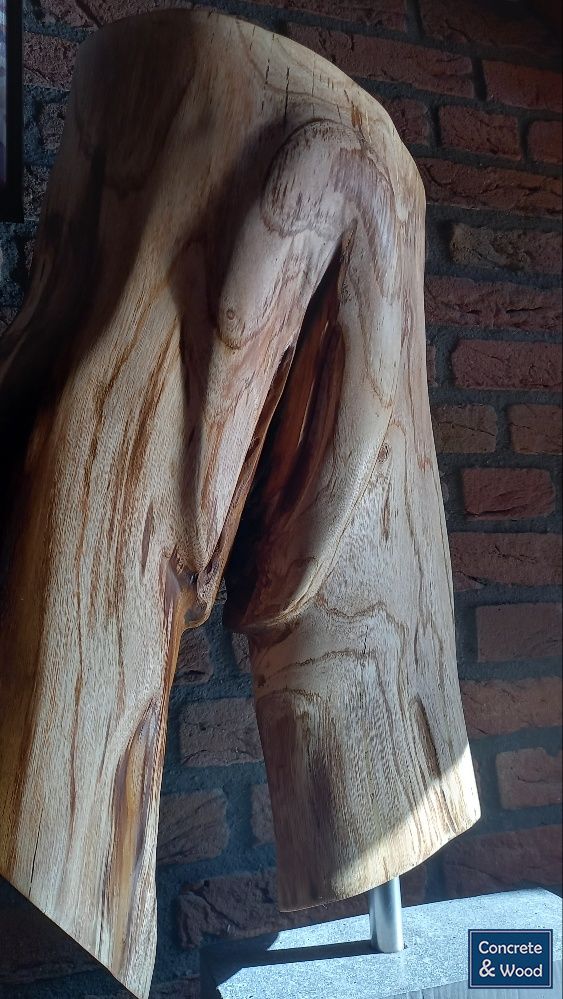 Het geheel staat op een sokkel van geschuurd beton met een rvs verbinding naar de houten sculptuur, het werk is 360 graden draaibaar.