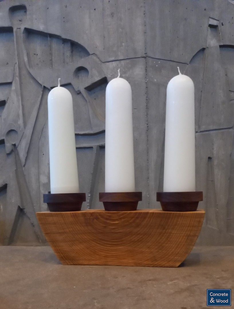 Onderdeel van een tijdelijk kerkinterieur. Driedelige kandelaar gemaakt van een blok massief essenhout met daarop notenhouten kaarsenstandaards.