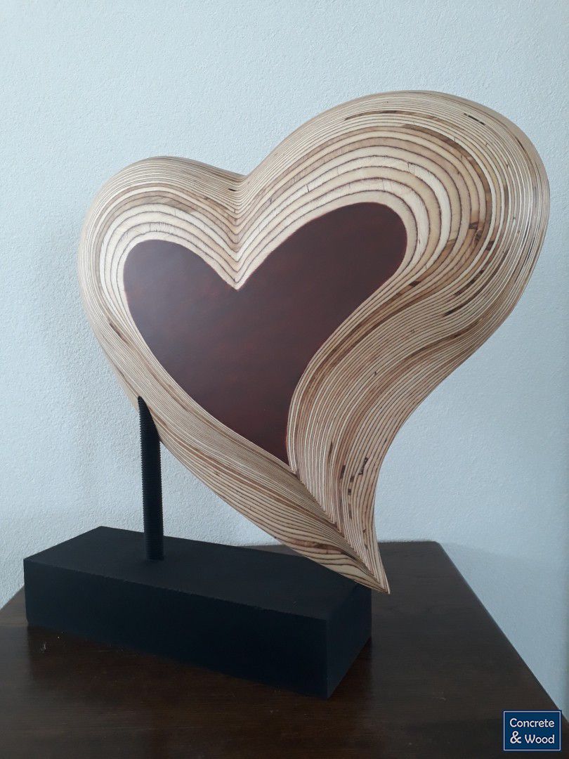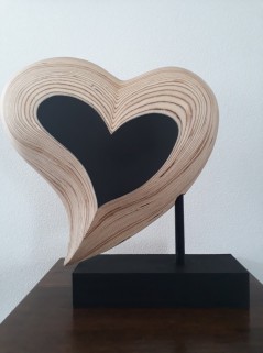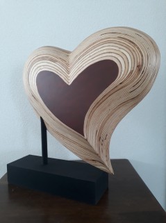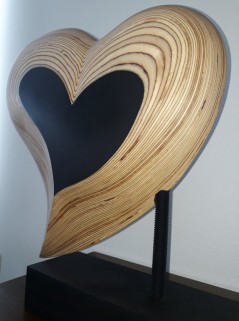 Afhankelijk van de plaats waar deze sculptuur "Kloppend Hart" komt te staan zijn er een voorkant in zwart en een achterkant in mahonierood voor de kern van dit hart, dus 2 mogelijkheden om dit werk te beleven.