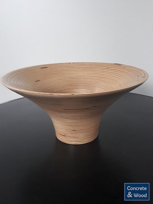 Berkenmultiplex gestapeld, verlijmd, gedraaid op de draaibank, geschuurd en in de wax.