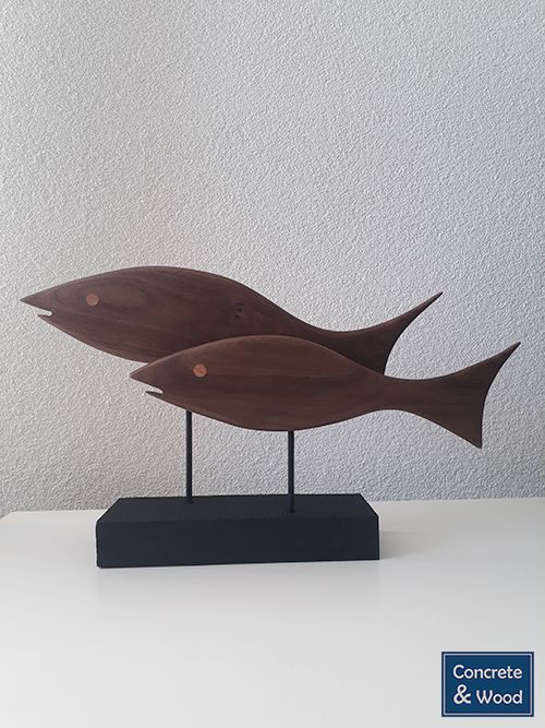 Notenhout als basis voor vissen. Een prachtig object in een verlichte vitrinekast.