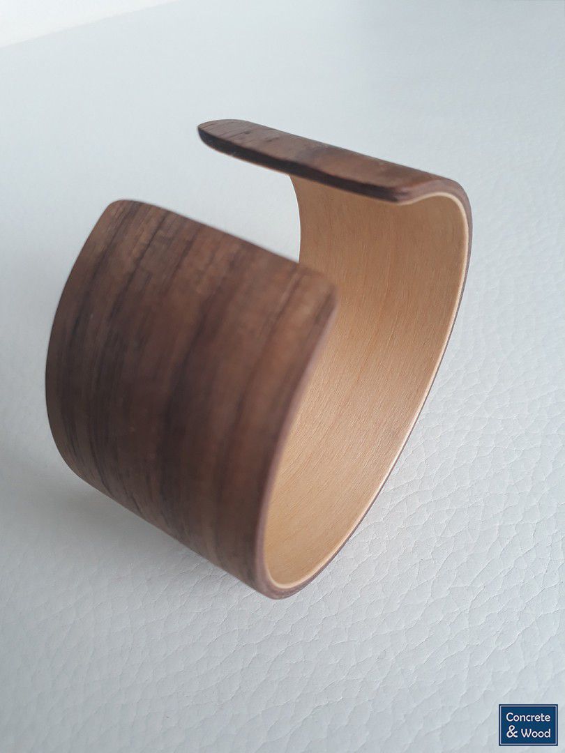 Het werken met fineer geeft oneindig veel mogelijkheden voor diverse soorten armbanden, een groot aantal dunne laagjes fineer geeft voldoende sterkte voor een
